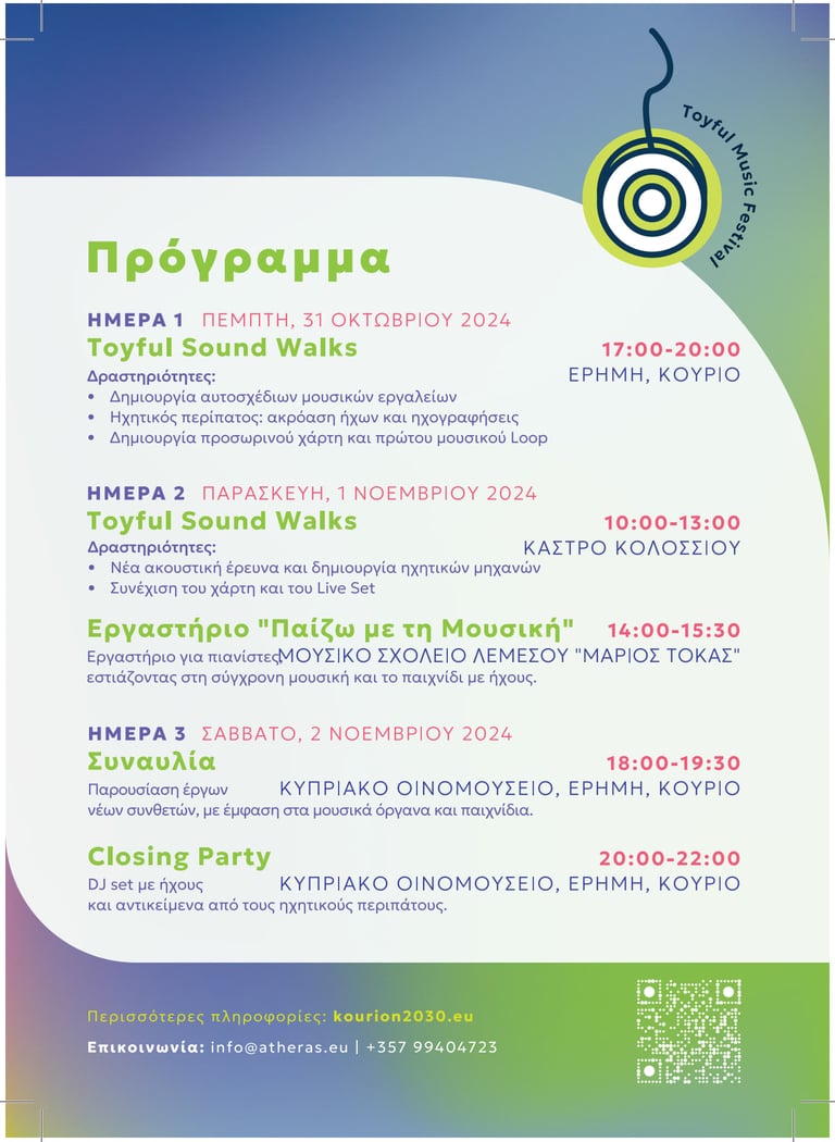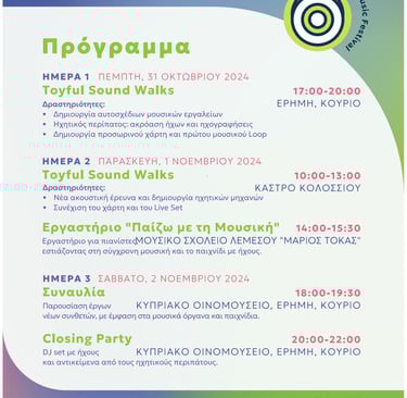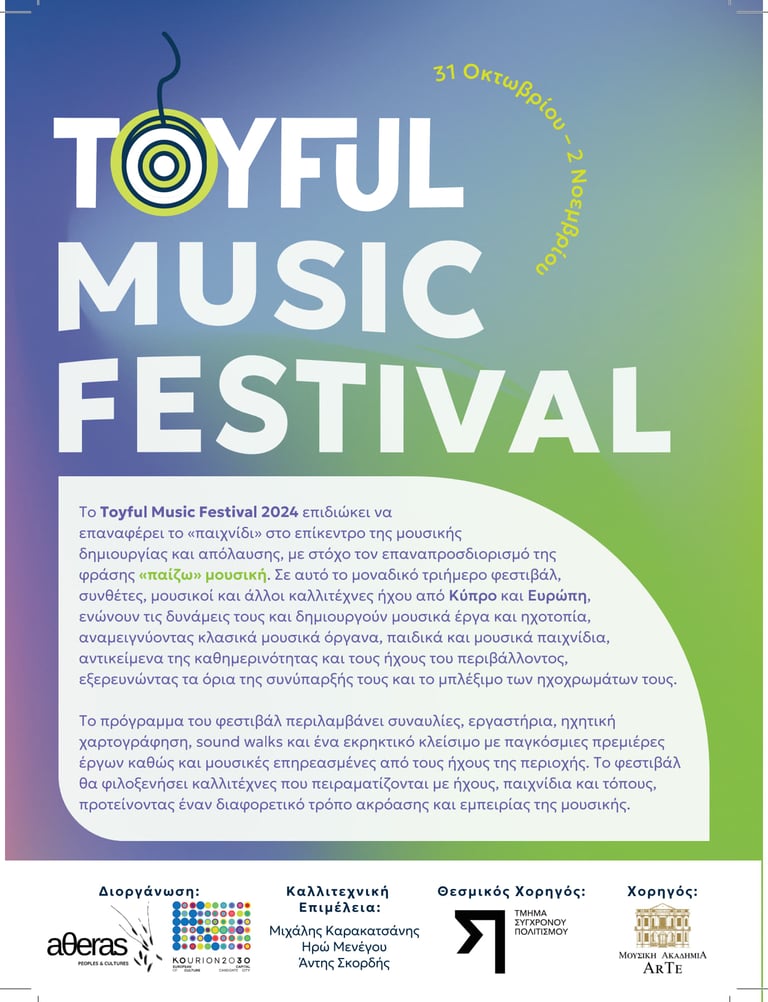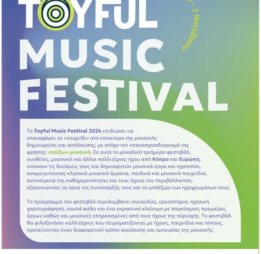 Το Toyful Music Festival 2024 επιδιώκει να επαναφέρει το «παιχνίδι» στο επίκεντρο της μουσικής δημιουργίας και απόλαυσης, με στόχο τον επαναπροσδιορισμό της φράσης «παίζω» μουσική. Σε αυτό το μοναδικό τριήμερο φεστιβάλ, συνθέτες, μουσικοί και άλλοι καλλιτέχνες ήχου από Κύπρο και Ευρώπη, ενώνουν τις δυνάμεις τους και δημιουργούν μουσικά έργα και ηχοτοπία, αναμειγνύοντας κλασικά μουσικά όργανα, παιδικά και μουσικά παιχνίδια, αντικείμενα της καθημερινότητας και τους ήχους του περιβάλλοντος, εξερευνώντας τα όρια της συνύπαρξής τους και το μπλέξιμο των ηχοχρωμάτων τους.
