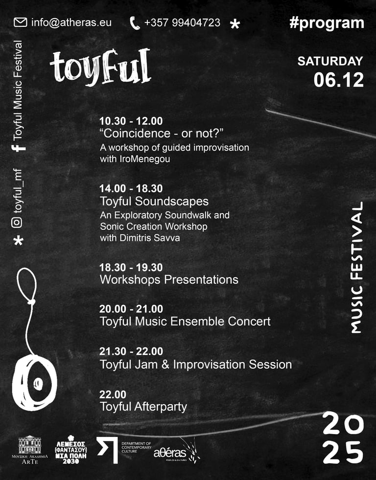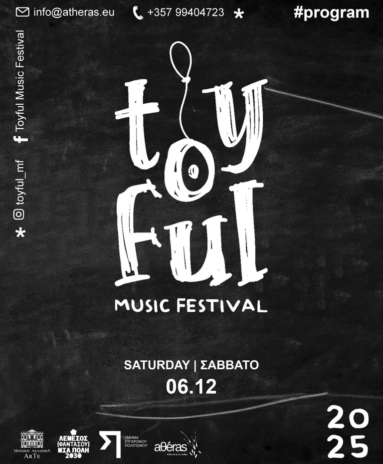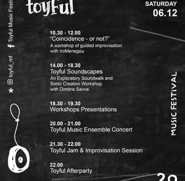 Toyful Music Festival seeks to bring "play" back to the centre of musical creation and enjoyment, aiming at playing around with the concept of "playing" music. In this unique three-day festival, composers, musicians and other sound artists from Cyprus and the world, join forces and create musical works and soundscapes, mixing classical musical instruments, children's and musical toys, everyday objects and environmental sounds, exploring the limits of their coexistence and the blending of sound colours.